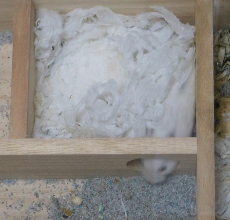 ↑ 上の写真の寝床の拡大です。寝ていたハム君が起き出して、部屋の出口近くに顔が見えます。