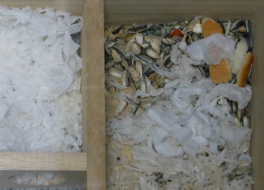 貯蔵した食べ物の上を巣材のティッシュで覆っている行動は、隠している行動です。