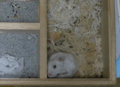 ↑ 上の写真の寝床の拡大です。寝ていたハム君が起き出して、部屋の出口近くに顔が見えます。